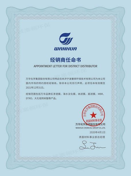 鑒于濟(jì)寧波塞頓環(huán)保技術(shù)有限公司卓越的水處理技術(shù)服務(wù)能力,經(jīng)過嚴(yán)格的考察與考核后,萬華化學(xué)特授權(quán)濟(jì)寧波塞頓環(huán)保技術(shù)有限公司為萬華化學(xué)膜產(chǎn)品的經(jīng)銷商。